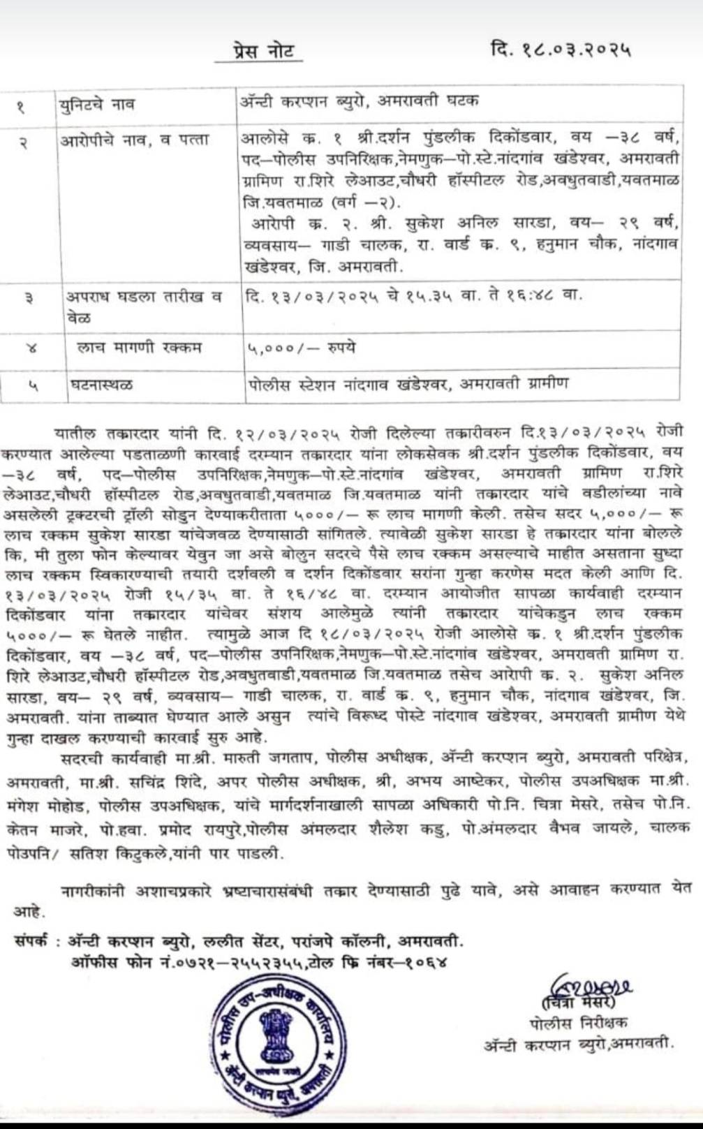 दर्शन पुंडलीक दिकोंडवार,वय -३८ वर्ष, पद-पोलीस उपनिरिक्षक, नेमणुक पो.स्टे. नांदगांव खंडेश्वर, ह्याने पोलिस स्टेशनच्या आवारातच लाचेची मागणी करून ती स्वीकारण्याची तयारी दर्शविली होती.मात्र वेळेवर संशय आल्याने ती रक्कम ठरलेल्या वेळी न स्वीकारता “टाळाटाळ केल्या”ने सदरहू दोघांवरही अखेर लाचेची मागणी केल्याबद्दल गुन्हे दाखल करण्यात आल्याने अमरावती पोलिस दलात एकच खळबळ उडाली आहे.
