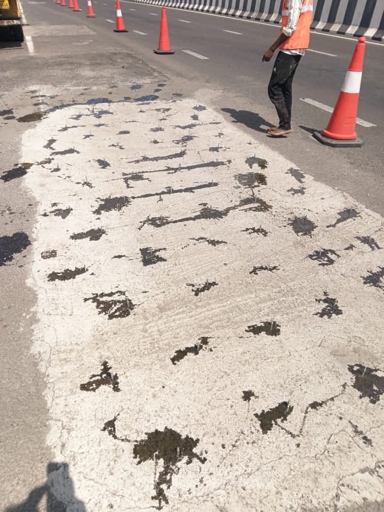काल रात्री चॅनेल 442 वर मुंबई दिशेने सिमेंटरोडचा एक बेल्ट 200 मीटरचा त्यावर ग्राऊंटिंग इंजेक्शन्सचे नोजल्स ड्रिल करून लावले होते ही एक दुरुस्तीची प्रक्रिया आहे ह्यात हे नोजल्स एका सोल्युशन्सने घट्ट काँक्रिट रोडवर बसवले जातात त्याचा अवधी हा 24 तासाचा असतो as माहिती घेतल्यावर कळलं.
