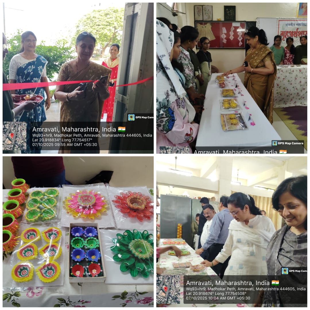 कार्यक्रमाच्या उद्घाटक वैद्य मॅडम यांनी प्रदर्शनी मध्ये ठेवलेल्या स्वहस्तेकलेंनी तयार केलेल्या दिव्यांची पाहणी करत असताना विद्यार्थ्यांना प्रोत्साहन देण्याच्या उद्देशाने “केवळ पुस्तकी शिक्षण हे आदर्शाच्या प्राप्ती करीता असफल ठरते. शिक्षणातून व्यक्तिमत्व आणि उत्पादकत्व यांचा विकास झाला पाहिजे .कुटुंब चालविण्याची आपली भागीदारी समर्थपणे पेलण्याची ताकद तिला या शिक्षणातून मिळावयास पाहिजे. कारण परालंबित्वामुळेच स्त्रीला समाजात कनिष्ठ दर्जा प्राप्त झाला आहे. समाजवादी आणि लोकशाही मूल्यांची बांधिलकी राखून नव्या समाज व्यवस्थेत नवीन जबाबदारी घेण्यास मुलींना सक्षम बनवण्याचे मार्गदर्शन प्राचार्य मॅडमनी केले .या प्रदर्शनीमध्ये बीए भाग 1,2 व 3 च्या विद्यार्थ्यांनी स्वहस्तेकलेचा उपयोग करून दिवे विक्रीचे स्टॉल लावण्यात आले .भारतीय महाविद्यालयाच्या प्राचार्या आराधना वैद्य मॅडम यांनी विद्यार्थ्यांचे कौतुक तर केलेच आणि मोठ्या प्रमाणात दिवे सूद्धा विकत घेतले .त्याचबरोबर इतर प्राध्यापक, शिक्षक आणि शिक्षकेतर कर्मचाऱ्यांनी सुद्धा दिवे विकत घेण्यासाठी मोठ्या प्रमाणात गर्दी जमवली होती .त्यांना दिवे बनवण्याचे ऑर्डर सुद्धा दिल्या गेल्या. अशा प्रकारे कोरोना काळामध्ये बेरोजगार झालेल्या युवतींना या स्वयंरोजगारामुळे रोजगार प्राप्त होऊ शकतो .आणि आम्ही प्रशिक्षण दिलेल्या युवती समाजात अनेक प्रशिक्षित युवती तयार करू शकते आणि येत्या 2030 वर्षापर्यंत करोडो युवतींना रोजगार मिळवून देऊ शकते या उद्देशाने गृहअर्थशास्त्र विभागाच्या डॉक्टर भडके मॅडम यांनी विद्यार्थिनींना स्वावलंबी बनवण्याचे प्रशिक्षण तर दिलेचं.आणि यशस्वीरित्या प्रदर्शनी सुद्धा पार पाडली. त्याना वैशाली वरघट ताईंनी सुद्धा मदत केली.