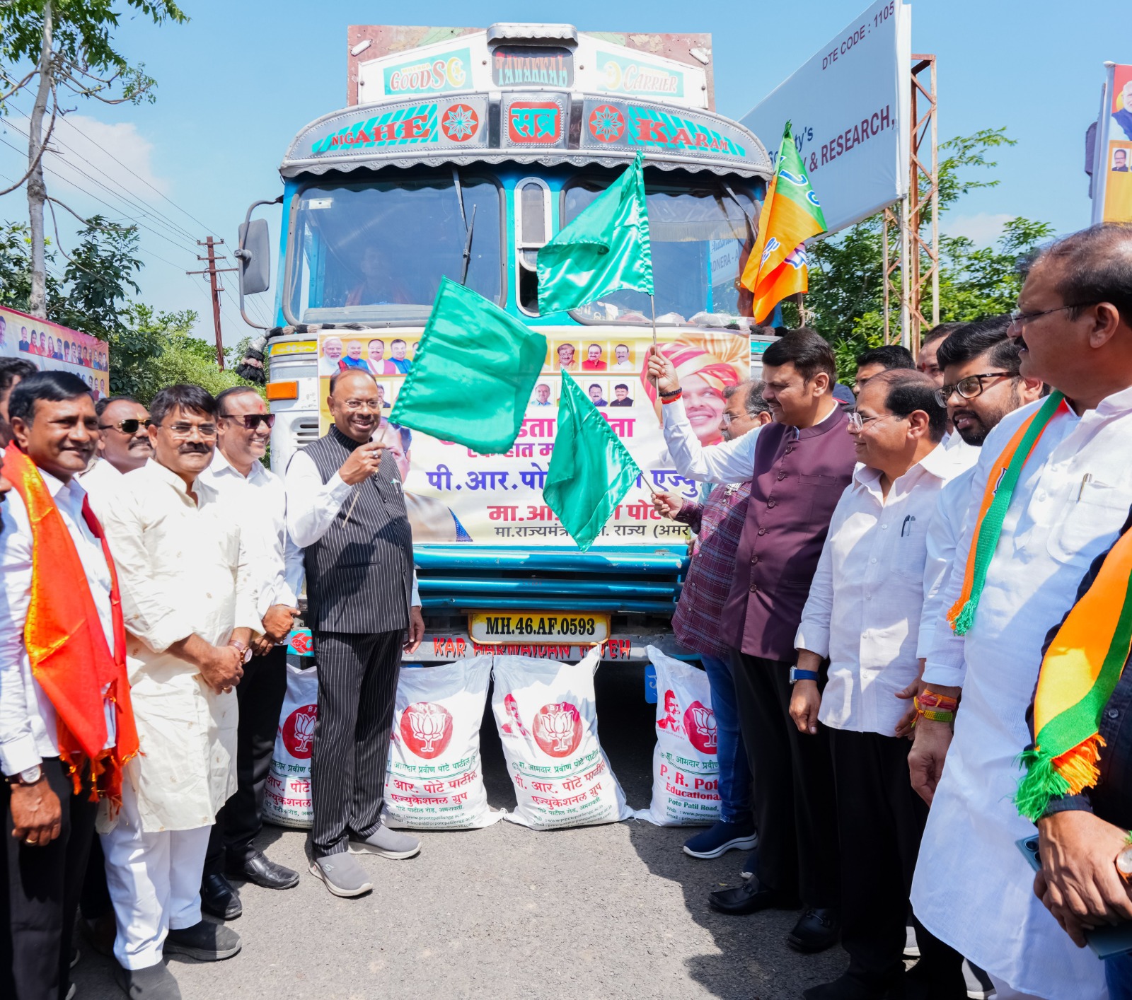 अमरावती, दि. 13 (जिमाका) : राज्यातील अतिवृष्टी झालेल्या भागात मदत म्हणून पी. आर. पोटे पाटील एज्युकेशनल ग्रुपतर्फे जीवनावश्यक साहित्य रवाना करण्यात आले. मुख्यमंत्री देवेंद्र फडणवीस यांनी साहित्याच्या तीन ट्रकला हिरवी झेंडी दाखविली.